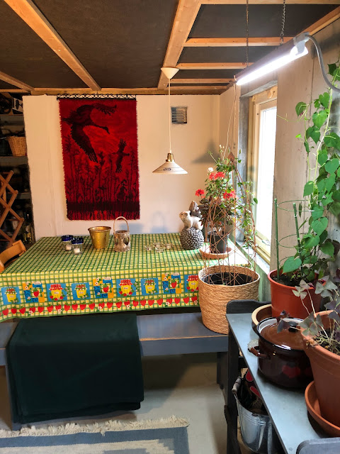 Så fint det har blitt i kjelleren! Det er jo hyggelig å kunne ta frem gamle ting en har gjemt på. Så fin den ekornstatuen på bordet er. Plantene kommer nok til å trives der.